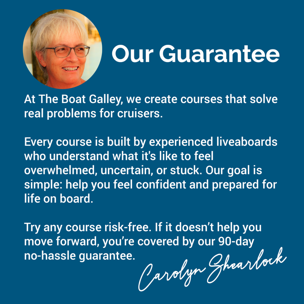 Just ask! I’m Carolyn Shearlock, founder of The Boat Galley, and I’d love to help. Whether you're unsure if a course is right for you or have a question we didn’t cover, feel free to email me directly. You won’t get a bot—you’ll get a real reply from someone who’s been there.
